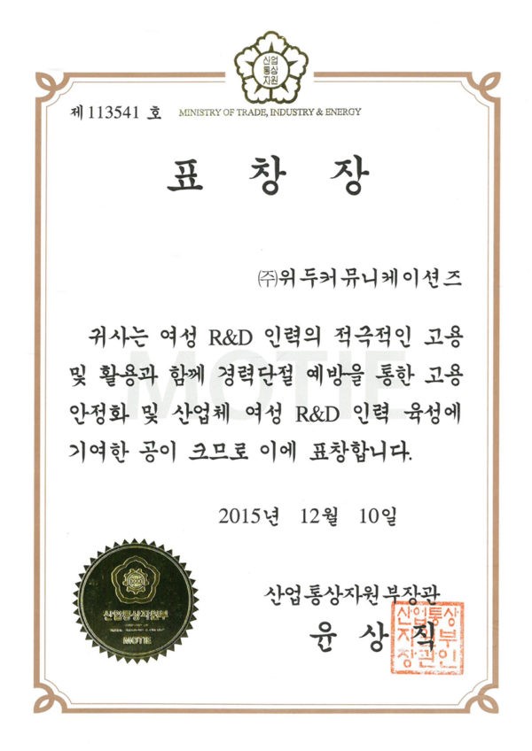 산업통상자원부 표창장 페이지 정보 작성자 WeDu 댓글 0건 조회 6,114회 작성일 19-05-30 19:34 본문 2015-12-10 표창장 제 113541호 여성 R&D 인력 고용 산업통상자원부장관 윤상직 List Previous서울클러스터 어워드 우수상 19.05.30 Next감사장 제 143호 19.05.30