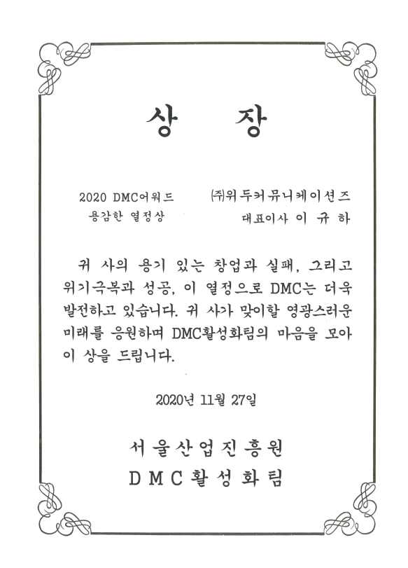 2020 서울산업진흥원 2020 DMC어워드 페이지 정보 작성자 WeDu 댓글 0건 조회 5,621회 작성일 21-12-31 12:57 본문 2020-11-27 2020 DMC어워드 용감한 열정상 서울산업진흥원 DMC활성화팀 List Previous2020 기술혁신 우수기업 21.12.31 Next2018 소년한국 우수 어린이 도서 19.05.30