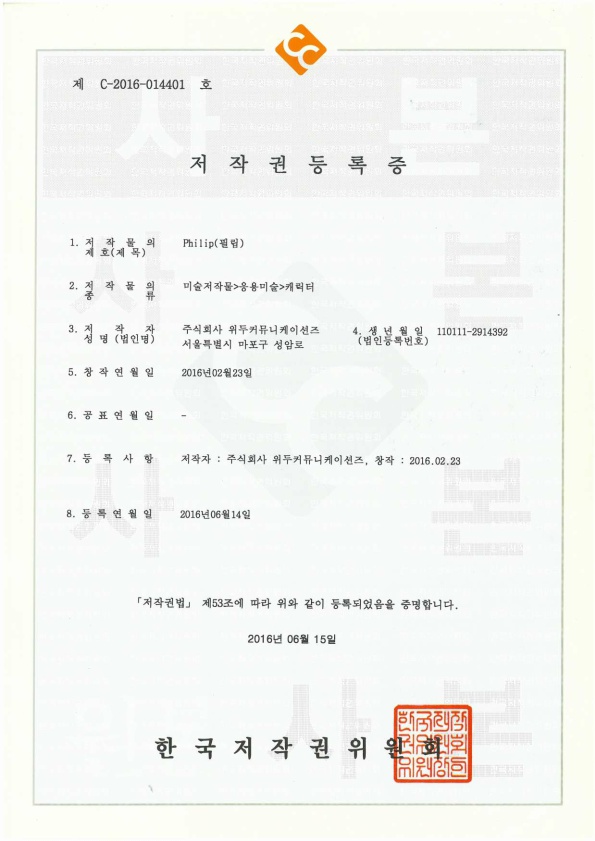 [한국/저작권] 필립 페이지 정보 작성자 WeDu 댓글 0건 조회 5,933회 작성일 19-05-30 19:09 본문 2016-06-14 저작권 C-2016-014401 필립 / 미술저작물>응용미술>캐릭터 List Previous[한국/저작권] 월터 19.05.30 Next[한국/저작권] 아리스 19.05.30
