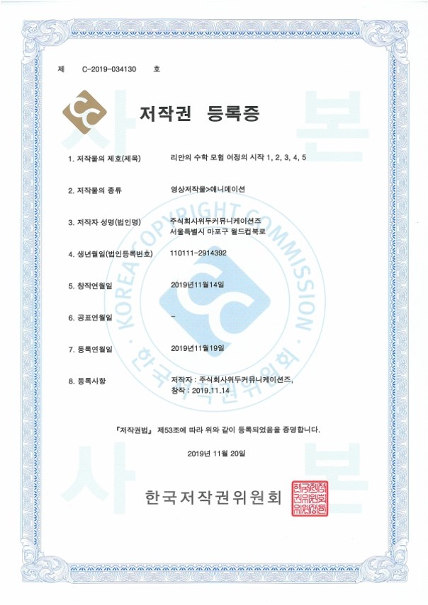 [한국/저작권] 리안의 수학 모험 여정의 시작 1,2,3,4,5 페이지 정보 작성자 WeDu 댓글 0건 조회 5,863회 작성일 21-12-31 12:36 본문 2019-11-20 저작권 C-2019-034130 영상저작물>애니메이션 List Previous[한국/저작권] OLL KIDS/MATH 21.12.31 Next[한국/저작권] 리안의 수학 모험 애니메이션 OST 19.11.25