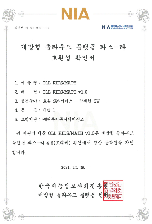 [한국/확인서] OLL KIDS/MATH 파스-타 호환성 확인서 페이지 정보 작성자 WeDu 댓글 0건 조회 10,030회 작성일 21-12-31 12:48 본문 2021-12-29 확인서 제 SC-2021-09 점검분야 : 호환 SW서비스 - 탑재형 SW List Next[한국/인증서] OLL KIDS/MATH 클라우드 서비스 확인서 21.12.31